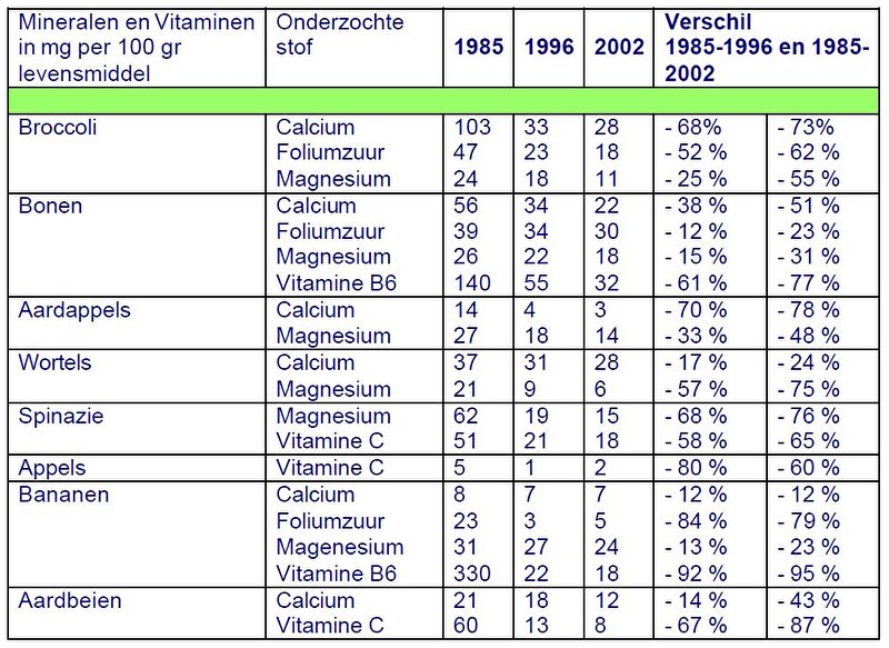 Zoals je kunt zien in de deze tabel is het aantal mineralen en vitaminen in onze voeding de afgelopen jaren dramatisch gedaald. Tussen 1985 en 2002 is hier uitgebreid onderzoek naar gedaan. Je kunt op je klompen aanvoelen dat dit weinig goeds betekent voor onze gezondheid.