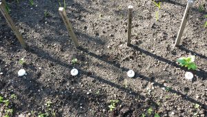 In een deel van de proeftuin hebben we teelaarde ter dikte van 7 cm met de schelpkalk vitaliser gevitaliseerd. Daarna hebben we de strook ca. 15 cm doorgespit. Het pootgoed in deze strook is ook gevitaliseerd. (FOTO: onderste 3 planten)