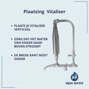 Installeer de vitaliser in de waterleiding direct achter de hoofdkraan. Plaats je vitaliser verticaal met de brede kant onder en laat het water van onder naar boven stromen. Zo levert de vitaliser een bijdrage aan het energetische veld en worden eventuele negatieve aardstralen positief beïnvloed.